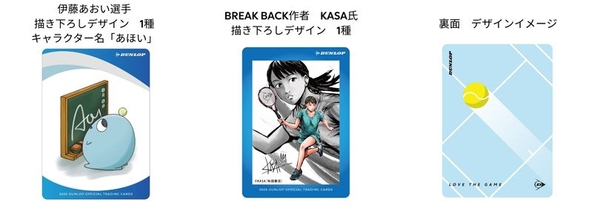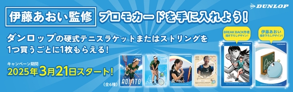 キャンペーン期間中に対象のダンロップ硬式テニスラケット、もしくはダンロップ硬式テニスストリングをご購入いただいた方にプロモーションカードをランダムで1枚プレゼントします。プロモーションカードのデザインは、全部で6種類となっており、キャンペーン特別デザインとして、「月刊少年チャンピオン」(秋田書店)で連載中のBREAK BACK(ブレークバック)作者KASA氏による描き下ろしデザイン1種、伊藤あおい選手描き下ろしキャラクターデザイン1種、その他伊藤あおい選手写真デザインが4種です。このキャンペーンでしか手に入らない貴重なカードです。ぜひこの機会にダンロップ製品をお買い求めください。