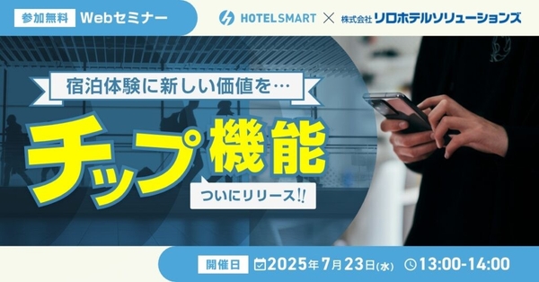 会員制リゾート事業、ホテル・旅館運営再生事業を担う「株式会社リロバケーションズ」が2024年3月に設立した子会社「株式会社リロホテルソリューションズ(所在地:東京都新宿区新宿、代表取締役社長 島田康平)」は、ホテル・旅館業界の課題解決のため、ホテル管理システム<HOTEL SMART>を提供する「xxx(エイジィ)株式会社」と2社共同で2025年7月23日(水)「宿泊体験に新たな価値をもたらすチップ機能」をテーマとした無料ウェビナーを開催します。