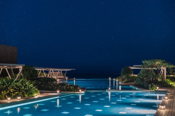 敷地内には南国らしい植物が育ち、海と繋がるようインフィニティプールがあり、加温式で一年中 24 時間利用可能です。昼には青い海と空を望み、夕方には海に夕日が沈むサンセット、夜には水中照明が灯り満天の星とともに、水辺で優雅な時間を過ごせる場所です。プールは、水深の異なるエリアがパズルの様に組み合わされ、深さ 10cm の水盤のようなエリアでは、水着を着ることなく気軽に水と戯れることができます。