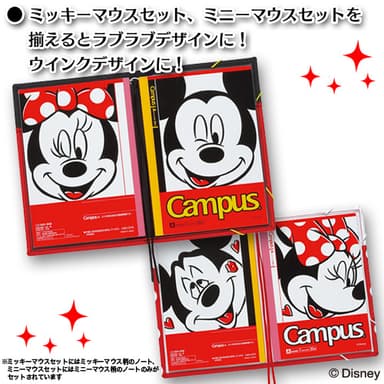 第一弾は、ミッキー・ミニーのA5サイズキャンパスノートに可愛いカバーが付いた『システミック・キャンパスノートA5セットミッキー・ミニー』となります。使いやすいA5サイズのキャンパスノートと収容力抜群のノートカバーをセットにしました。ノートカバーにはオリジナル限定チャームが付属します。