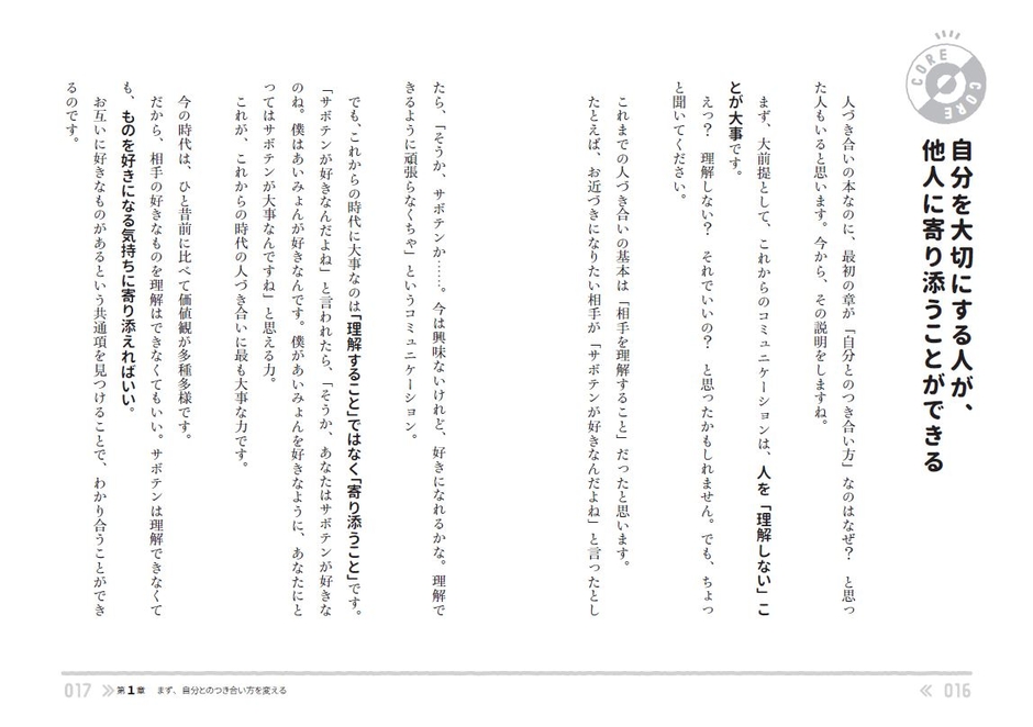 今までの時代の人づき合いの悪い部分をそぎ落とし、これからの時代の重要なポイントだけに着目した本書は、「まず自分とのつき合い方を変える」など、今すぐ取り入れられそうな、目から鱗の対人スキルが満載。