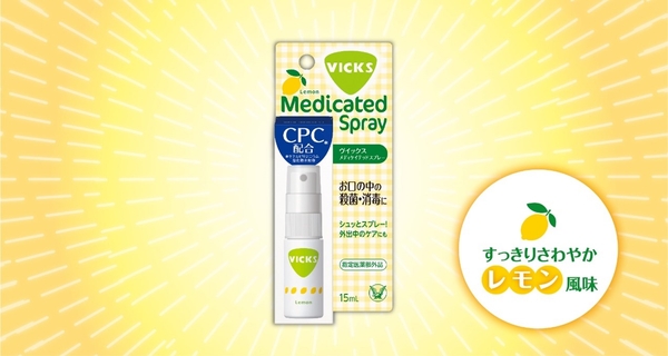 「ヴイックス メディケイテッド スプレー」は、殺菌成分のCPC(セチルピリジニウム塩化物水和物)が配合された、ヴイックスシリーズでは初めて※となる口腔内専用すっきりさわやかなレモン風味の殺菌・消毒スプレーです。CPCは細菌の細胞膜に付着し、細胞膜成分を変性・分解した後、細胞内に入りこむことで、殺菌効果を発揮します。「ヴイックス メディケイテッド スプレー」を口腔内にシュッとスプレーすると、薬剤が瞬間的に口腔内に広がり、口腔内を殺菌・消毒し、のどの炎症による声がれや痛みを抑えます。また、マスク着用時などに気になる口臭の除去にもお使いいただけます。 ※国内で販売しているヴイックスシリーズにおいて