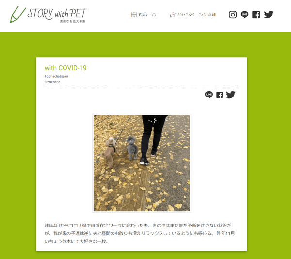 昨年4月からコロナ禍でほぼ在宅ワークに変わった夫。世の中はまだまだ予断を許さない状況だが、我が家の子達は逆に夫と昼間のお散歩も増えリラックスしているようにも感じる。 昨年11月いちょう並木にて大好きな一枚。
