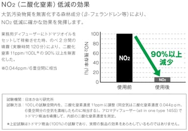 業務用アロマディフューザー(all in one type 145S)にトドマツオイルをセットして稼動させた時の、のべ2分間の噴霧(実験時時間120分)により、二酸化窒素11ppm/100L※の90%以上を無害化した。