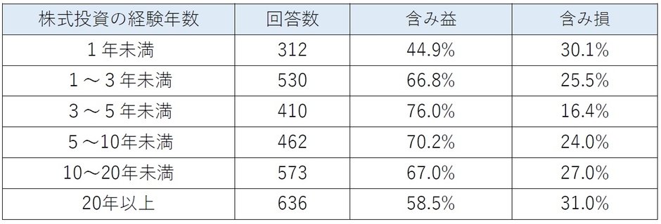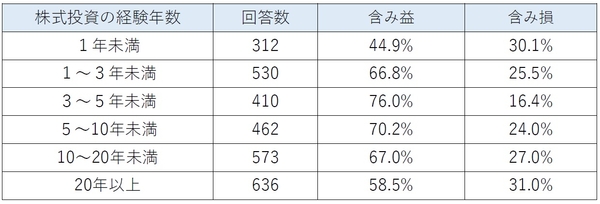 投資経験の年数別で見てみると、「3~5年未満」の人が含み益の割合が最も高く76.0%でした。最も低いのは「1年未満」の人の44.9%でしたが、その次に低いのは「20年以上」の経験を持つ人の58.5%です。また、「1~3年未満」は66.8%、「10~20年未満」は67.0%と、ほぼ同じ割合でした。