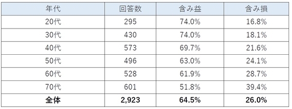 年代別に見ると、最も割合が高かったのは「20代」と「30代」で、ともに7割を超える74.0%の人が含み益でした。その割合は年代が上がるにつれて下がり、「70代」の51.8%が最も低い結果となりました。