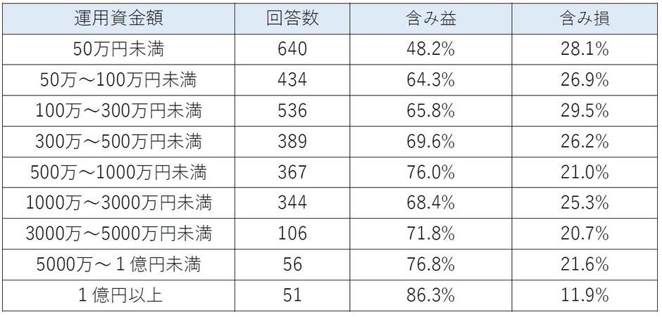 運用資金額別の分析では、運用資金が大きい人ほど含み益である割合が高くなりました。「1億円以上」の資金を持つ人では、含み益となっている割合が86.3%と最も高く、最も低い「50万円未満」の人では含み益の人は48.2%でした。