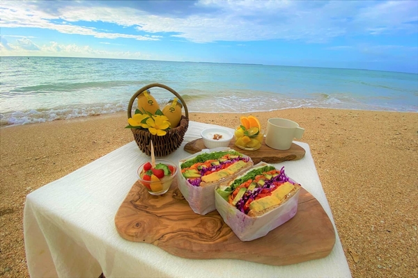 レストラン「Ooli Ooli(おーり おーり)」からはテイクアウトできる「ビーチブレックファスト」をご用意します。目の前に海が広がる「ビーチハウスプール」や、海辺で本と過ごせる「BOOKS&CAFE」など、ビーチの他にも静かで穏やかな時間を過ごせる場所が点在しています。自分のお気に入りの場所を見つけ、ゆっくりとした朝の時間を過ごすことができます。提供するのは、沖縄食材を取り入れた彩り豊かなサンドイッチやピクルス、発酵食材であるヨーグルト。サンドイッチにはラフテーやメカジキなど沖縄で親しまれている食材を使用し、バナナやマンゴー、黒糖ピーナッツ、グラノーラを添えた食物繊維が豊富なヨーグルトをご用意します。朝の爽やかな潮風と優しい波音を聞きながら、腸内環境を整える朝食を楽しめます。