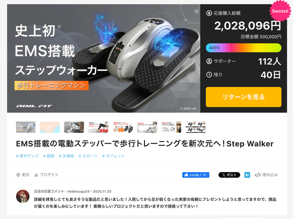 Riml Outdoor Japan合同会社(リムルアウトドアジャパン、本社:東京都西東京市、代表:新倉健太)は、運営するRIML FIT(リムルフィット)から2025年11月23日(日)に先行発売した、新感覚の全自動歩行トレーニングマシン「EMS搭載 ステップウォーカー®」が、クラウドファンディングサイトMakuakeにて販売開始からわずか1日で100万円、1週間で200万円を達成したことをお知らせいたします。本製品は、高齢者の歩行トレーニングや運動不足解消を全自動でサポートし、健康維持や筋力アップを目的に開発されました。
