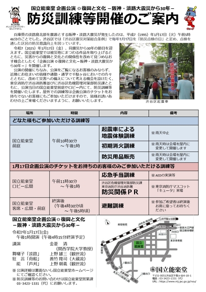 防災訓練ほか併せて開催『国立能楽堂 1月企画公演』 阪神・淡路大震災から30年の日に、災害からの復興と文化との関係性を改めて見つめ直す