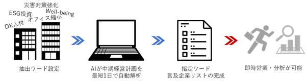 ターゲットとしたいワードを設定(複数可能、上限無し)することで、中期経営計画の中で該当ワードを言及している企業リストを最短1日で作成します。企業抽出にあたっては、業種、エリア(本社拠点)で絞り込むことも可能な為、ターゲットを絞り込んだ精度の高い営業リストの作成が可能となります。