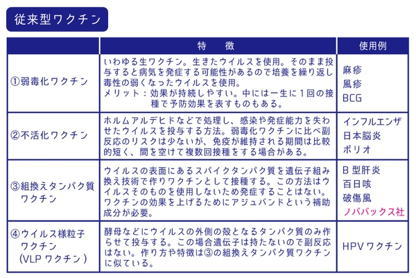 従来、人に応用されているワクチンは一般的に大きく4種類に分けられます。