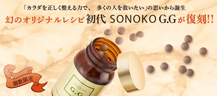 株式会社SONOKO(本社:東京都中央区銀座、代表取締役社長:宇田川裕昭、以下SONOKO)は、1990年に創業者鈴木その子が10年以上の歳月をかけて開発し、今日までに累計販売数400万本を突破し爆発的なヒットを遂げたサプリメント『SONOKO G.G』を、初代のレシピを再現して『TOKINO G.G』として復刻販売を開始しました。