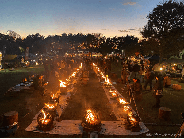 300席以上のチェアで焚火を楽しむことができます。焚火を眺めながら食事を楽しむことができます(「焚火食堂」で購入したもののみ)。