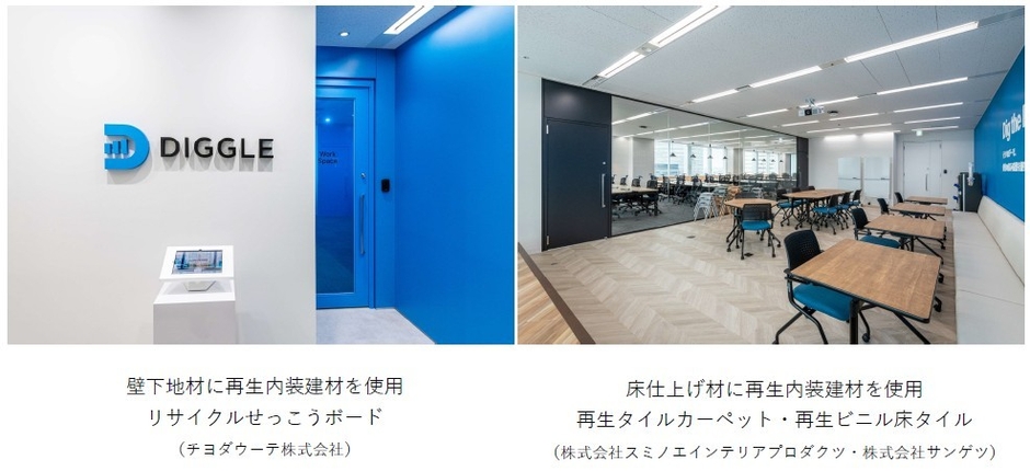 2025年10月~2026年2月の期間で実施したDIGGLE社の入居工事では、再生材料から製造された再生内装建材(リサイクルせっこうボード、再生タイルカーペット)を採用した「水平リサイクル」に業界に先駆けて取り組みました。