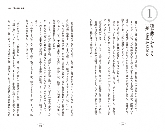 才能豊かな人は、わずかな触れ合いでも縁と気づき、その縁を活かして、さらに豊かな人生を歩む、という意味です。本書にはここを深く掘り下げると同時に、キャッチした縁を広げ、深めながら長く関係を続けていくための心づかいや、そのためのシステムづくり、さらには悪い縁を見分けていく方法などが書かれています。