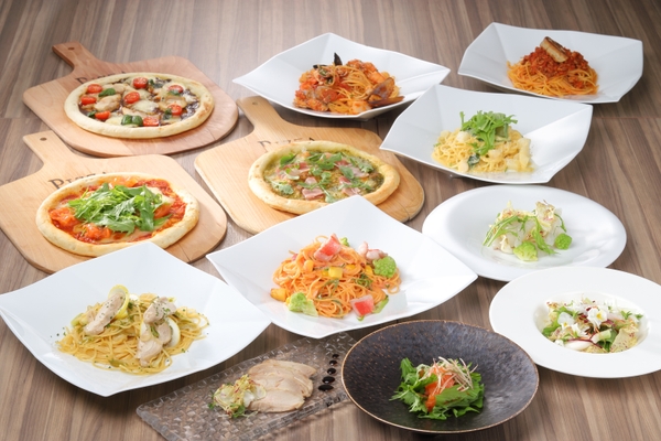 店内の石窯で焼き上げる「ピッツァ」をはじめ、「パスタ」、「シーフードのパエリア風」、「アクアパッツァ」など、地中海料理をご用意。さらに「京豆腐のギリシャサラダ風」、「京揚げ入りひじきの和風タラモサラダ」、「京水菜とシーフードのマリネ 琴引きの塩ぽんず」など、京の食材を地中海料理風に仕上げたメニューも登場いたします。「カレーオムライス」や「ハンバーグ」、「エビフライ」などのメニューが揃うお子さまコーナーもあり、ご家族皆さまでお楽しみいただけます。