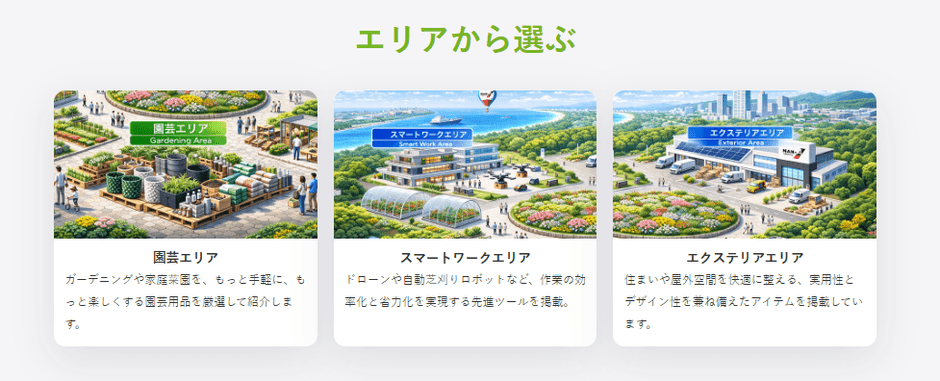園芸用品だけでなく、農業用ドローンやガレージも取り扱っており、農業・暮らしに関わる幅広いジャンルの商品が揃っています。