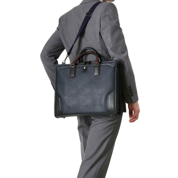 派手さは無くても作りが良い鞄は、第一印象が大切なシーンで好印象。上品でスマートなイメージのサフィアーノ合皮と、味のある牛革のコンビネーション。ブラックとネイビーのシックな2Color。大きく開くファスナー仕様で、鞄の中身が見やすく書類を出し入れしやすい。こだわりの革ハンドルはデザインと強度を兼ね備えた、この鞄のポイントでもある。