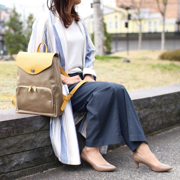 メンズビジネスで使用される強度の高いナイロンツイル生地と、シュリンクレザーを組み合わせ、捻り金具をポイントに配置して女性らしいテイストに。一定の収納量を備えているが、スマートな印象を与えるデザイン。ベルトをレザーでタイトな仕様にするなどの工夫で、荷物を詰めても見た目に重たい感じがしない。