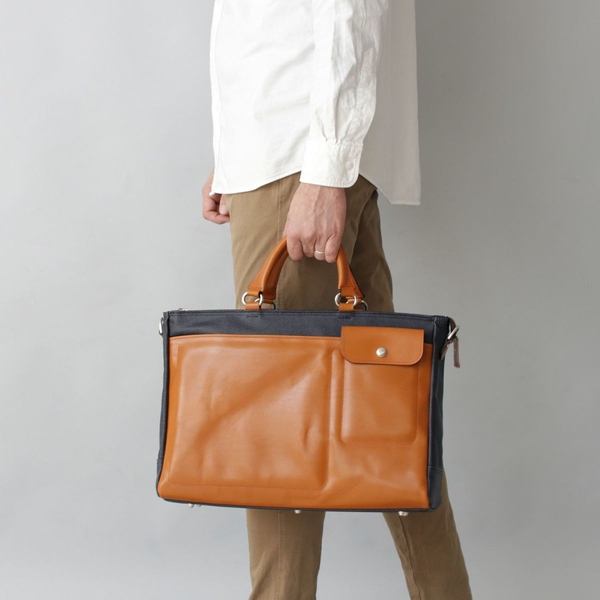 PVCコーティングを施したデニムに、牛革を大胆かつ贅沢に掛けあわせたコンビネーション。ハンドルも革にこだわった仕様。デニムはいつまでも美しく、革は経年変化を楽しむことができる。前胴側にスマートフォンとiPad miniが収納できるウレタンポケットを装備。スマートな薄マチのフォルムで形状も美しく、通勤を華やかに彩る。