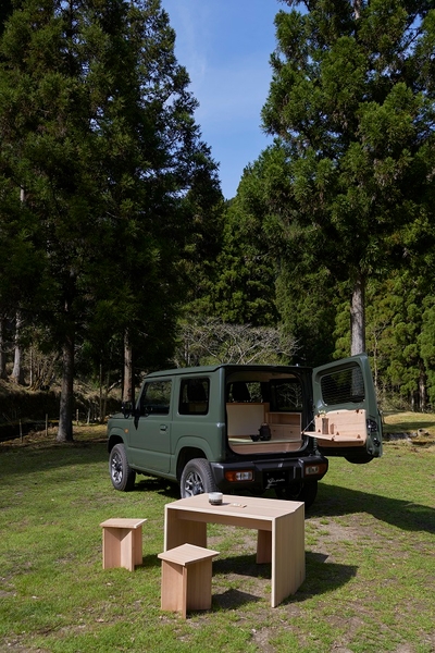 前席との境には、雪見障子の構造から着想を得た上下に可動する「障子」。天井には柔らかな風合いが美しい金糸が織り込まれた「西陣織」。両側の棚は「指物」の技術を用い、京都北西部・京北の杉ですっきりと仕上げました。床にはい草のにおいが車内に充満しないようにと配慮した、和紙製の「畳」。リアドアの内側には、「指物」の技術で床の間のような棚を設け、「漆」を施した「錺金具」が特別な棚であることを暗示。花器などを飾る場所として、茶室の趣を残しました。そして前席、シフトレバーに銀の「高蒔絵」を施し、亭主である運転手が経年の変化をそっと楽しめる遊び心も忘れません。お茶室のごとく、ジムニーに職人の技を集結しました。