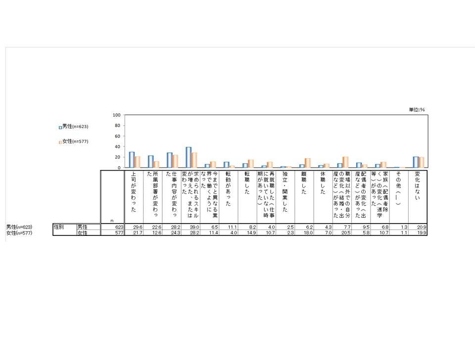 ◆「職場以外での自分の変化(結婚・出産など)があった」男性は7.7%、女性は20.5%