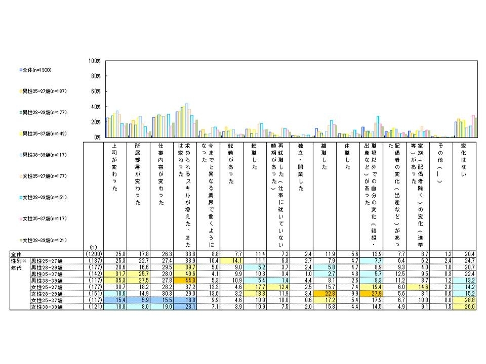 特に、女性の28~29歳の回答は27.9%と全体平均(13.9%)を大きく上回り、調査した各層の中でも突出した数字となりました。女性の28~29歳の回答は、1位が「仕事内容が変わった」(30.3%)となっており、30歳を迎える女性は、キャリアと家庭の2つの変化の時期に当たっていることが見て取れます。