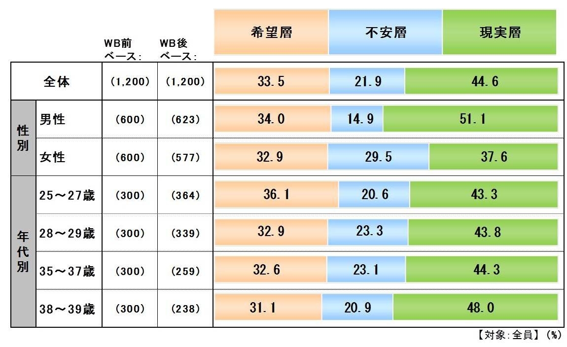 本調査では「現実層」が最も多く(44.6%)、「不安層」が最も少ない(21.9%)ことが分かりました。この傾向は男女ともに同様の結果が出ています。男女の傾向の違いをさらに見ると、女性は「不安層」の比率が男性と比較して高く(男性14.9%、女性29.5%)、逆に、「現実層」は男性が51.1%と女性に比較して高い(女性37.6%)といった結果になりました。「希望層」は大きな男女差は見られません。【図表3】