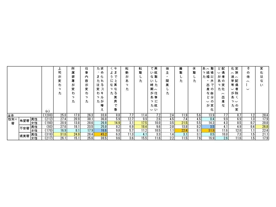 一方、「不安層」では男女差があり、男性は1位「上司が変わった」(27.6%)、2位「変化はない」(26.8%)となりましたが、女性は1位「職場以外での自分の変化(結婚・出産など)があった」(31.9%)、2位「離職した」(22.4%)と差異が出ました。