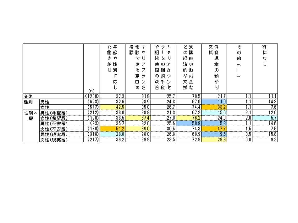 今回の調査では、ライフステージで変化を感じる事項について、職場に限定されがちな男性と、職場と家庭の両者に広がる女性の違いが明確となりました。変化の範囲の広さという点では女性の方が負担が大きく、このことが学びにおける受講動機の違い(不安を理由として学ぼうとする人が女性の方が多い)につながっている可能性があります。さらに、女性のなかでも、置かれている状況によって、学びのために求めている支援策は異なる結果が出ました。「女性活躍支援」を行う上では、対象者の置かれている状況を把握しなければ、適切な支援につながらない可能性があります。
