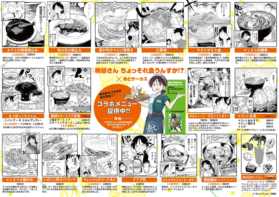 雑食系グルメ漫画「桐谷さんちょっそれ食うんすか!?」×ジビエ居酒屋「米とサーカス」の珍食コラボ!5月28日より計22品の珍メニューを高田馬場・渋谷で提供。