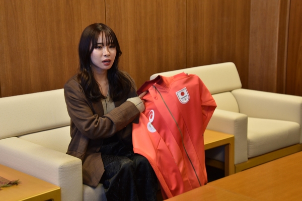 懇談ではまず、パリオリンピックで着たジャパンのウェアを披露した山本選手。小原学長からこれからの目標を問われると、「2025年9月に東京で開催される世界陸上と2026年に愛知で行われるアジア大会、そして4年後のロサンゼルスオリンピックに5000㍍で出場することを目指しています」ときっぱり。「アジア大会の時はぜひ盛り上げてください」と立花理事長らに呼び掛けました。