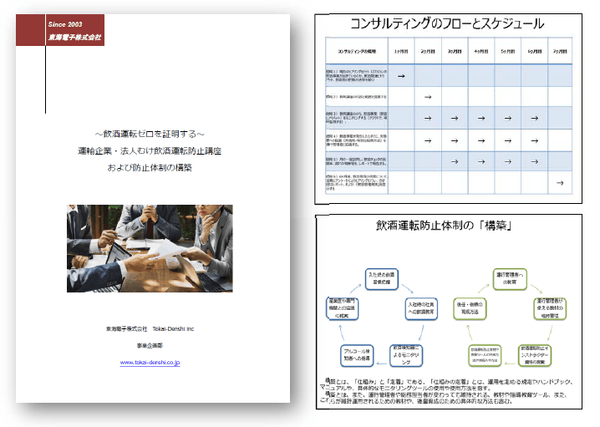 この度、当社が認定された教育コンサルメニューは、約半年かけて、AUDITの実施からアルコールの基礎講座や、アルコール検知器のデータ分析、教育資料の維持管理等を、持続性・継続性のある「かたち」として構築を⽀援する内容です。アルコール検知器をただ使っているだけでは飲酒運転は根絶できないということを、社として定着させるお⼿伝いを致します。