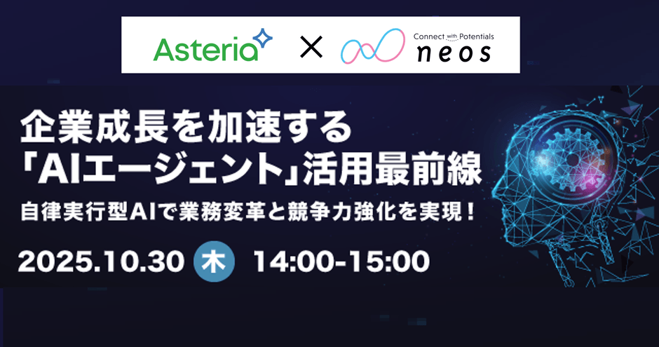 テクミラホールディングスの子会社であるネオス株式会社(本社:東京都千代田区、代表取締役 社長執行役員:池田 昌史、以下 ネオス)は、ノーコード技術で業務の自動化を支援するデータ連携ツール「ASTERIA Warp」を提供するアステリア株式会社(本社:東京都渋谷区、代表取締役社長:平野 洋一郎、以下 アステリア)と共同で、昨今注目を集めているAIエージェント※の活用方法や事例をご紹介するオンラインセミナーを10月30日(木)に開催いたします。