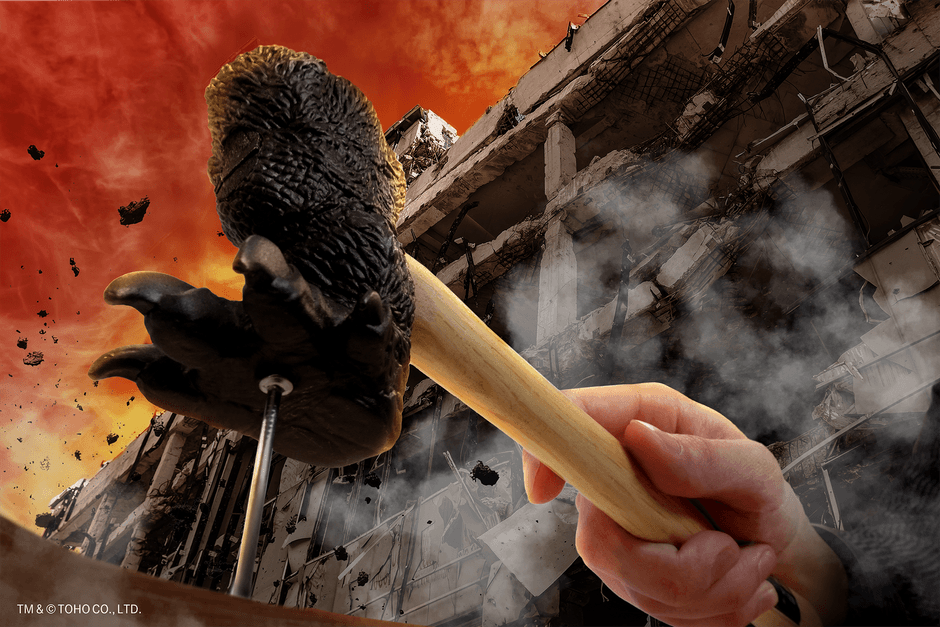 これまで数々のビルや建物を踏み潰してきたゴジラの足。ゴジラハンマーで釘を打つことであのシーンを再現できます。