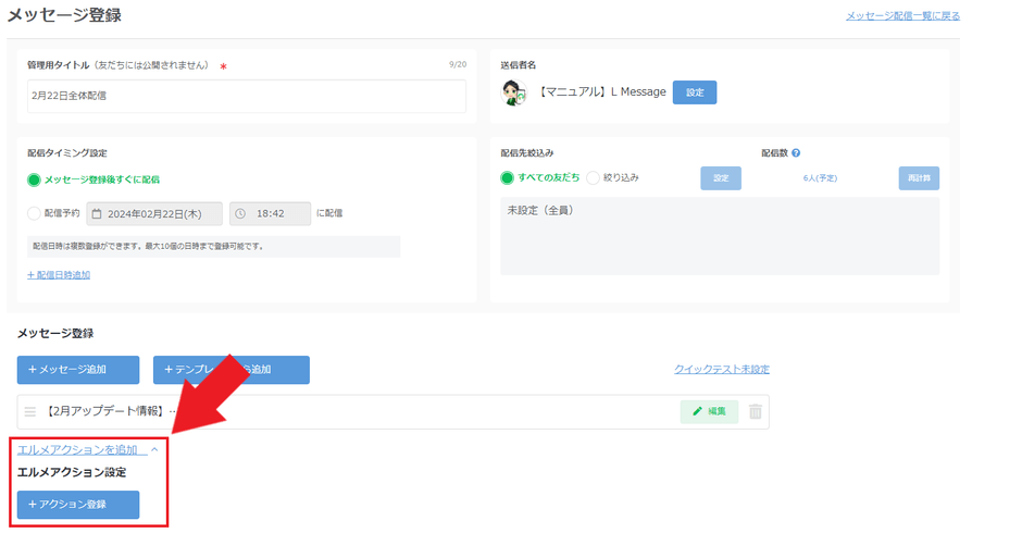 アップデートにより、メッセージ配信でエルメアクションの設定が可能となりました。