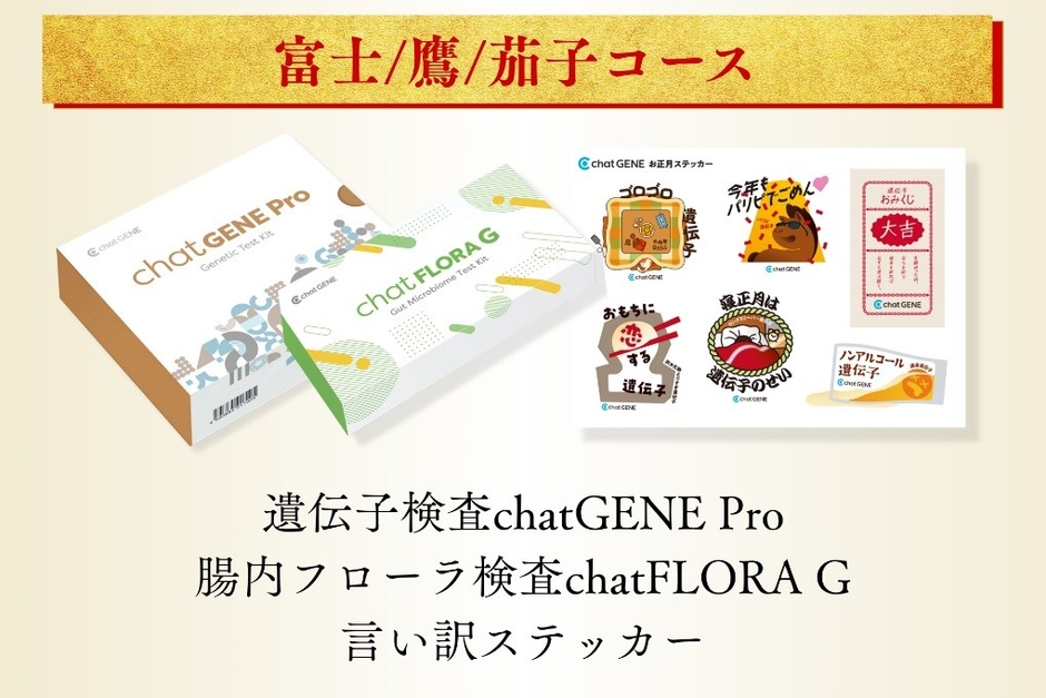 遺伝子検査「chatGENE Pro」1個、腸内フローラ検査「chatFLORA G」1個、言い訳ステッカー1枚