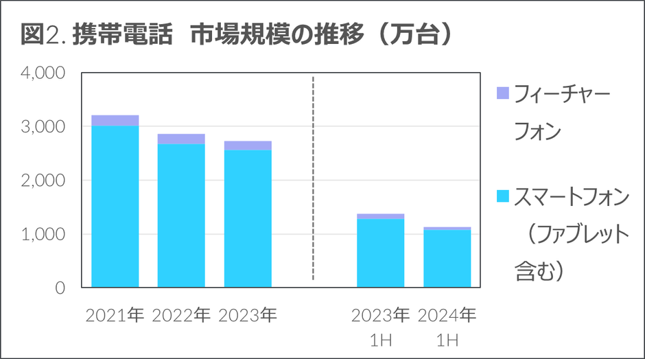 携帯電話市場は前年比18%減の1,130万台となった(図2)。そのうち96%を占めるスマートフォン(ファブレット含む)は同16%減の1,080万台、フィーチャーフォンは50万台と前年から半減した。