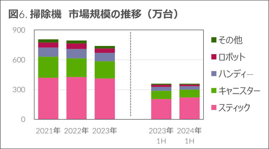 掃除機は前年並みの360万台となった(図6)。スティックタイプの数量が前年から7%増となった一方、キャニスタータイプは同4%減、ロボットタイプは同16%減となった。掃除機の過半数を占めるスティックタイプの数量構成比は前年からさらに4%ポイント伸長し61%となった。掃除機の税抜き平均価格は前年から5%上昇の26,000円となった。