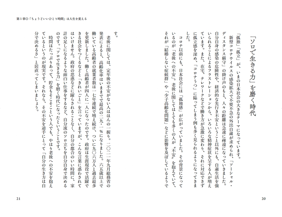 本書では「孤独」には「望まない孤独(消極的孤独)」と「自ら望んで得る孤独(積極的孤独)」があるとし、「自ら望んで得る孤独」を、「人と会えなくてさびしいけれど、その分、自由な時間ができたのでやりたいことがやれるようになった」と、好意的にとらえています。そして、人との繋がりを持ちながらも、自分の気持ちやひとりで過ごす時間を大切にし、さまざまな角度から、「孤独」を楽しむ提案をしていきます。