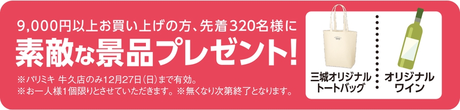 オープン記念としまして、9,000円(税込)以上お買い上げの方 先着320名様に、パリミキオリジナル トートバッグまたはワインをプレゼントいたします。どうぞこの機会にゲットしてください!