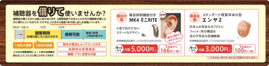 月額3,000円~(+税)の定額プランにて補聴器を貸出いたします。補聴器が使えるようになるか不安な方は、「借りる」ことから始めてみませんか?