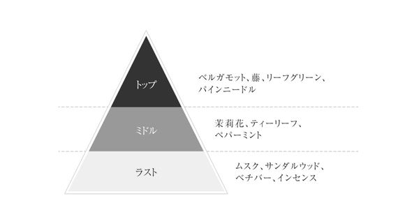 トップノート:ベルガモット、藤、リーフグリーン、パインニードル
