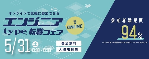 【参加者の94%※が“満足”と回答!】5/31(土)『type エンジニア転職フェア ONLINE』エンジニアのキャリアに役立つ限定セミナーも同時公開!