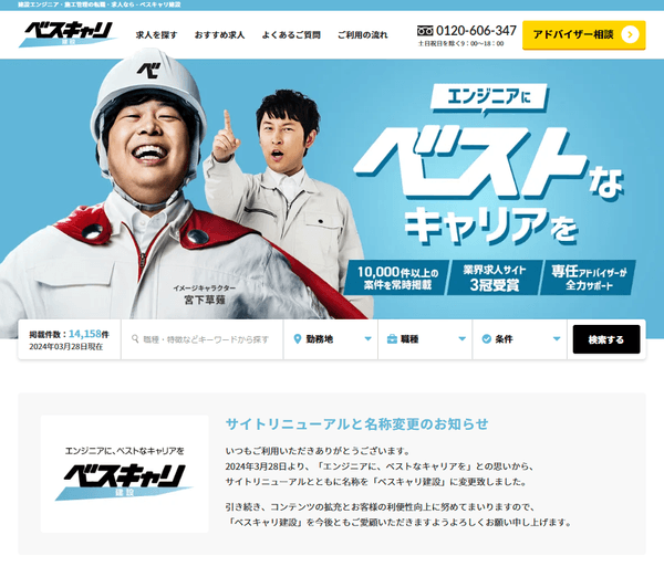 株式会社コプロ・ホールディングス(本社:名古屋市、以下「当社」)の子会社で、建設・プラントのエンジニア人財派遣を手掛ける株式会社コプロコンストラクションは、2014年から運用してきたエンジニア求人サイト「現キャリ」をリニューアルし、「ベスキャリ建設(https://www.g-career.net/)」として2024年3月28日にオープンしました。建設業界では2024年4月からの時間外労働の規制適用開始、いわゆる「2024年問題」を受けて、人員を増やすことで時間外労働を抑制しようと、エンジニア人財派遣への需要が高まっており、2023年度は年間約4万件の案件を獲得。自社求人サイトのより一層の強化を図ることで、建設エンジニアの採用を増やし、2024年問題で高まる建設エンジニア人財への需要に応えることを目指します。