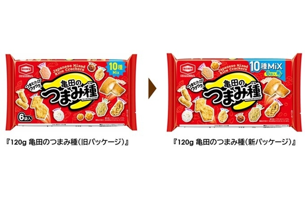 『120g 亀田のつまみ種』も9月下旬よりデザインリニューアルをします。『亀田のつまみ種』ならではの特長である、1個包装で10種類のおつまみが楽しめること、6個包装入りであることを、より分かりやすく伝えられるパッケージデザインに変更します。