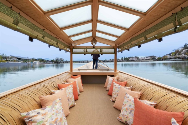 本アクティビティでは屋形舟「翡翠」を貸し切り、かつて四季の風景を愛でながら舟遊びをした平安貴族さながらの優雅な時間を過ごすことができます。翡翠は、京都で古くから親しまれてきた建材や装飾を用いて、伝統工芸に囲まれる雅な空間に仕上げた星のや京都専用の屋形舟です。例えば、舟枠には書院造に用いられる北山杉やヒノキ材を使用し、舟内には京町屋の犬矢来をイメージした竹の背もたれや、草木花で染め上げた柔らかな風合いのクッションを設えています。また、舟の側面の御簾を降ろすことでプライベートな空間を楽しむこともできます。翡翠の屋根には特殊なガラスがはめ込まれており、スイッチで白から透明に色が切り替えられる仕様です。嵐山の渓谷と青空を見上げて楽しむことができる、これまでにない屋形舟です。