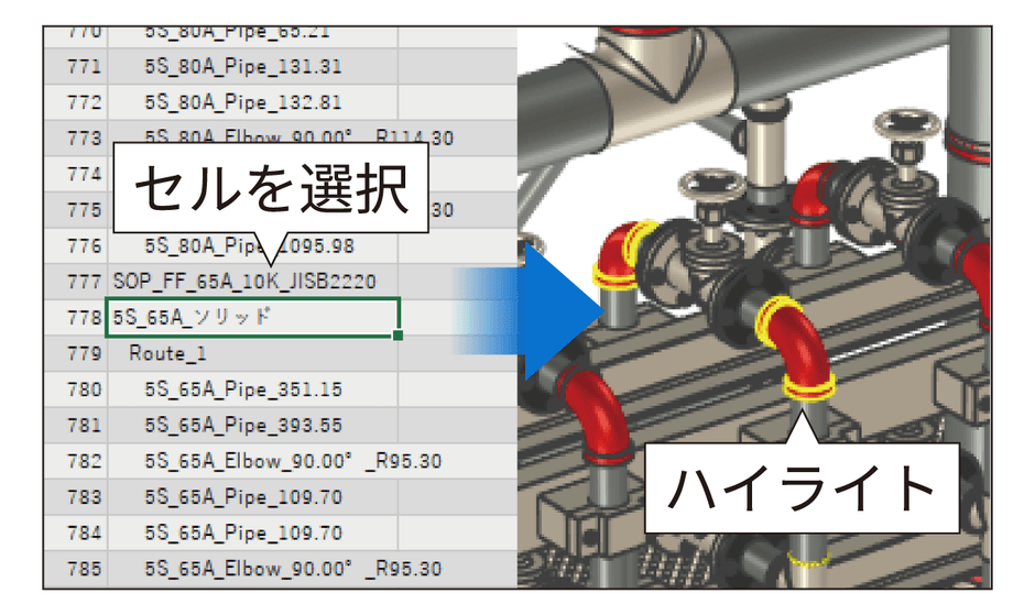 セレクション連携機能により、Excelでプロパティを編集中のパーツ/アセンブリがIRONCAD上でハイライト
