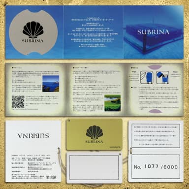 箱は濃紺に統一し『SUBRINA』が眠っていた海底をイメージさせ、ロゴは貝の輝きを思わせます。シリアルナンバータグがかかったボトルには世に一本だけの自然の装飾がなされています。ポアラー(フィルム状そそぎ口)、メッセージカードが同梱されます。また、メッセージカードへの印刷、のし紙名入れにも対応し、海とワインにまつわるギフトとして最適な商品となっております。